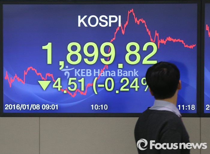 (서울=포커스뉴스) 남북 긴장고조와 중국발 악재 영향으로 코스피 지수 1900선이 무너진 8일 오전 서울 중구 KEB하나은행 딜링룸에서 한 직원이 전광판을 바라보고 있다.
