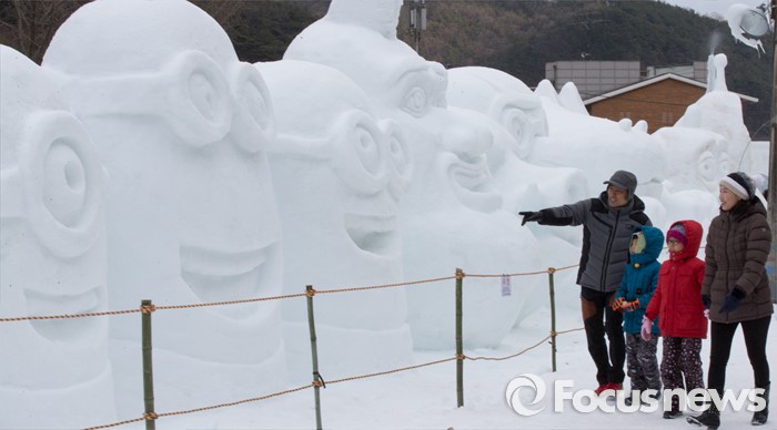 (청양=포커스뉴스) 8일 오전 충남 청양군 정산면 알프스마을에서 열린 칠갑산 얼음분수축제를 방문한 시민들이 눈으로 만든 조각작품을 관람하고 있다.