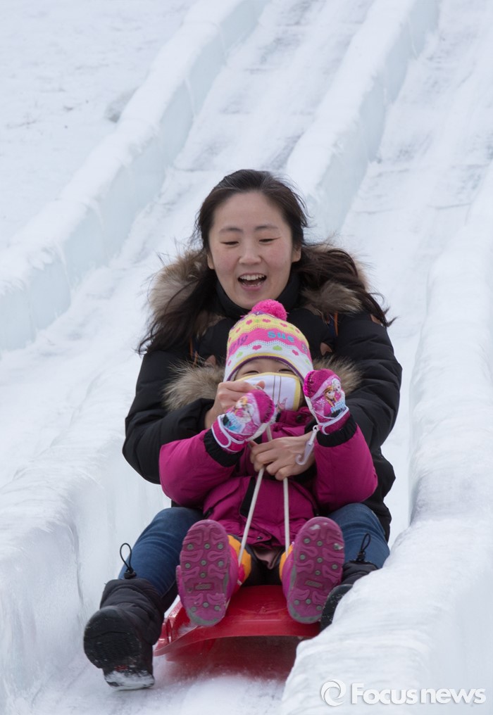 (청양=포커스뉴스) 8일 오전 충남 청양군 정산면 알프스마을에서 열린 칠갑산 얼음분수축제를 방문한 시민들이 썰매를 타며 즐거운 시간을 보내고 있다.