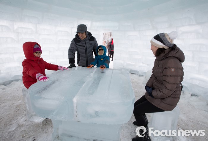 (청양=포커스뉴스) 8일 오전 충남 청양군 정산면 알프스마을에서 열린 칠갑산 얼음분수축제를 방문한 시민들이 얼음으로 만든 이글루를 체험하고 있다.