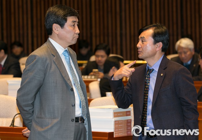 (서울=포커스뉴스) 이종걸(왼쪽) 더불어민주당 원내대표와 안규백 의원이 8일 오후 서울 여의도 국회에서 열린 의원총회에 참석해 대화하고 있다.