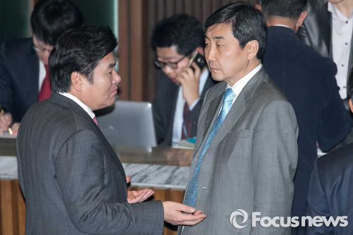 (서울=포커스뉴스) 원유철(왼쪽) 새누리당 원내대표와 이종걸 더불어민주당 원내대표가 8일 오후 서울 여의도 국회 본회의장에서 논의하고 있다.