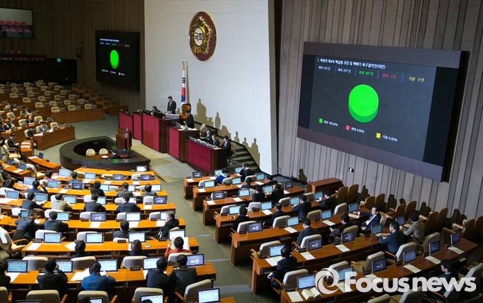 (서울=포커스뉴스) 8일 오후 서울 여의도 국회에서 열린 338회 국회(임시회) 3차 본회의에서 북한의 제4차 핵실험 규탄 및 핵폐기 촉구결의안(대안)이 재석 207인 중 만장일치로 통과되고 있다.