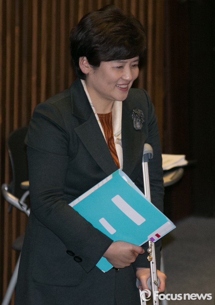 | △ 목발 짚고 회의 참석하는 강은희 |