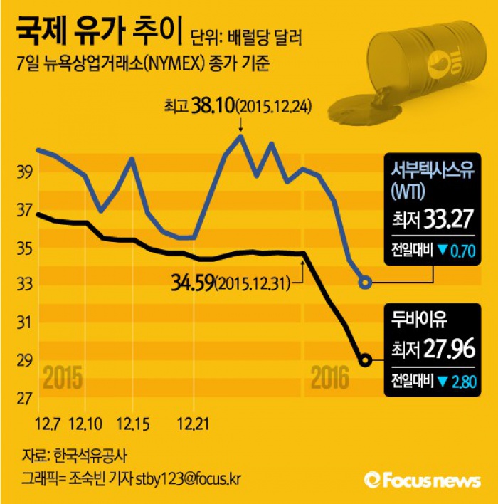 8일 금융투자업계에 따르면 7일(현지시간) 서부텍사스산중질유(WTI) 가격은 배럴당 33.17달러로 12년래 최저치를 기록했다. 같은날 중동 두바이유 현물 가격도 전날보다 2.80달러 하락한 배럴당 27.96달러로 집계됐다. 두바이유 가격이 20달러 대에 거래된 것은 2004년 4월 이후 처음이다. 두바이유는 1년 전 같은 기간에 비해 40% 이상 떨어졌다.