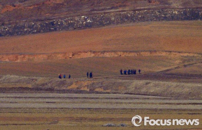 (파주=포커스뉴스) 군 당국의 대북확성기 방송 재개를 앞둔 8일 오전 경기도 파주 오두산 통일전망대에서 바라본 북한 개풍군 마을 주민들이 평온한 모습을 보이고 있다.