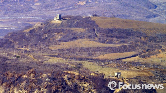 (파주=포커스뉴스) 군 당국의 대북확성기 방송 재개를 앞둔 8일 오전 경기도 파주 오두산 통일전망대에서 바라본 북한 개풍군 마을 인근에 군 초소가 보이고 있다.