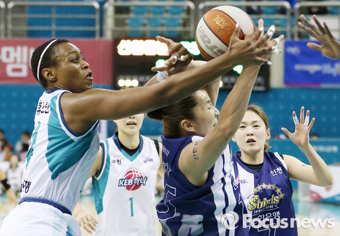 (부천=포커스뉴스) 8일 부천체육관에서 열린 2015-2016 여자프로농구 KEB하나은행-신한은행 경기에서 신한은행 신정자와 KEB하나은행 샤데 휴스턴이 리바운드볼을 다투고 있다.