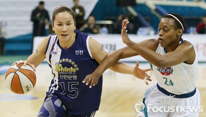 (부천=포커스뉴스) 8일 부천체육관에서 열린 2015-2016 여자프로농구 KEB하나은행-신한은행 경기에서 신한은행 신정자가 KEB하나은행 샤데 휴스턴의 마크를 뚫으며 골밑을 향해 대시하고 있다.