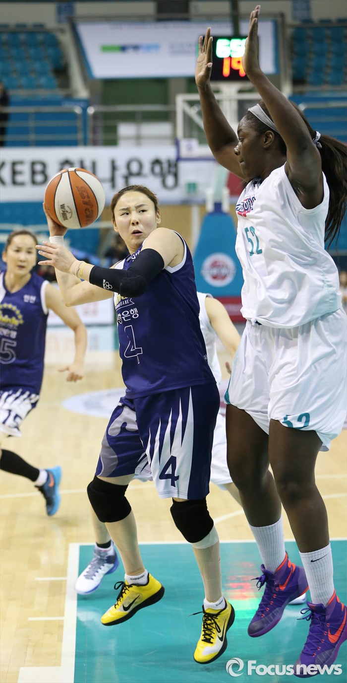 (부천=포커스뉴스) 8일 부천체육관에서 열린 2015-2016 여자프로농구 KEB하나은행-신한은행 경기에서 신한은행 최윤아가 골밑 돌파를 시도하다 KEB하나은행 첼시 리의 벽에 막히자 비하인드 패스를 시도하고 있다.