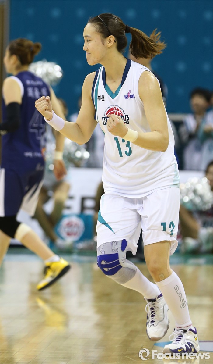 (부천=포커스뉴스) 8일 부천체육관에서 열린 2015-2016 여자프로농구 KEB하나은행-신한은행 경기에서 KEB하나은행 김정은이 2쿼터 막판에 3점슛을 성공시키고 두 주먹을 불끈 쥐고 있다.