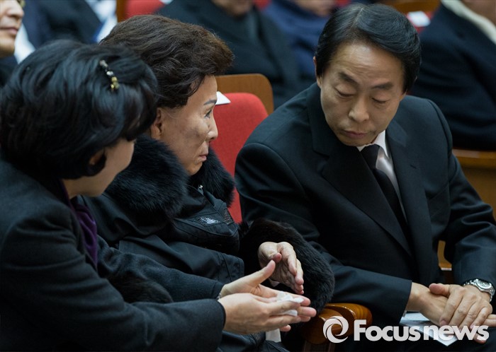 (서울=포커스뉴스) 9일 오후 서울 동작구 국립현충원에서 열린 '김영삼 대통령 추모 부활 성시 기념예배'에 참석한 손명순 여사와 차남 김현철 씨가 대화하고 있다.