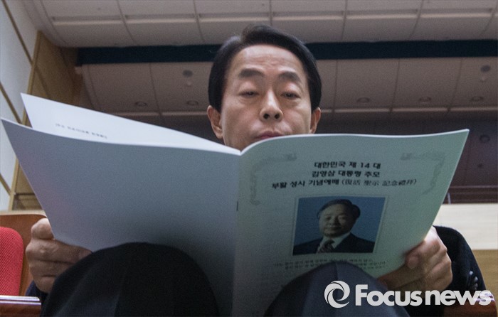 (서울=포커스뉴스) 9일 오후 서울 동작구 국립현충원에서 열린 '김영삼 대통령 추모 부활 성시 기념예배'에 참석한 차남 김현철 씨가 식순을 살피고 있다.