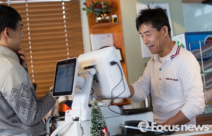 (서울=포커스뉴스)8일 오전 서울 성북구 '영철버거'에서 이영철 사장이 웃는 얼굴로 손님을 맞으며 주문을 받고 있다. 고려대 앞 명물로 꼽히는 '영철버거'가 최근 경영난으로 문을 닫았다가, 고려대를 다녔던 학생들이 영철버거와의 추억을 잊지 못해 십시일반 도와 가게를 옮겨 재오픈 했다.