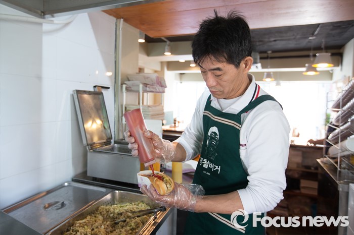(서울=포커스뉴스)8일 오전 서울 성북구 '영철버거'에서 이영철 사장이 햄버거를 만들고 있다. 고려대 앞 명물로 꼽히는 '영철버거'가 최근 경영난으로 문을 닫았다가, 고려대를 다녔던 학생들이 영철버거와의 추억을 잊지 못해 십시일반 도와 가게를 옮겨 재오픈 했다.