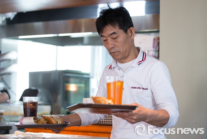 (서울=포커스뉴스)8일 오전 서울 성북구 '영철버거'에서 이영철 사장이 손님에게 버거와 음료를 나르고 있다.고려대 앞 명물로 꼽히는 '영철버거'가 최근 경영난으로 문을 닫았다가, 고려대를 다녔던 학생들이 영철버거와의 추억을 잊지 못해 십시일반 도와 가게를 옮겨 재오픈 했다.