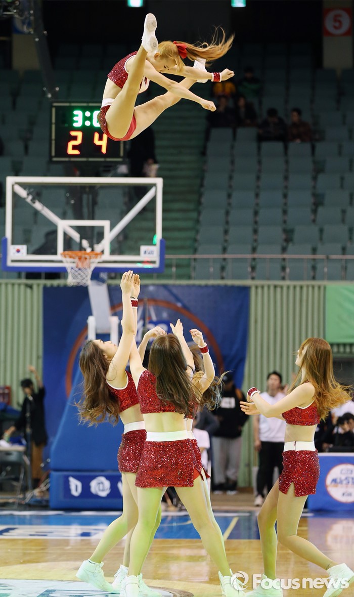 (서울=포커스뉴스) 15일 서울 잠실실내체육관에서 열린 2015-2016 프로농구 올스타전 오프닝 행사로 열린 연예인 농구팀-유소년 올스타 경기에서 치어리더가 고난도의 스턴트 치어리딩을 선 보이고 있다.