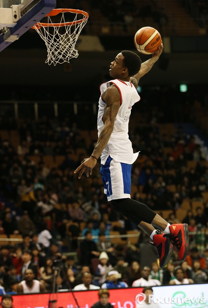 (서울=포커스뉴스) 10일 서울 잠실실내체육관에서 열린 2015-2016 프로농구 올스타전 덩크슛 콘테스트 예선에서단신 조 잭슨이 덩크슛을 시도하고 있다.