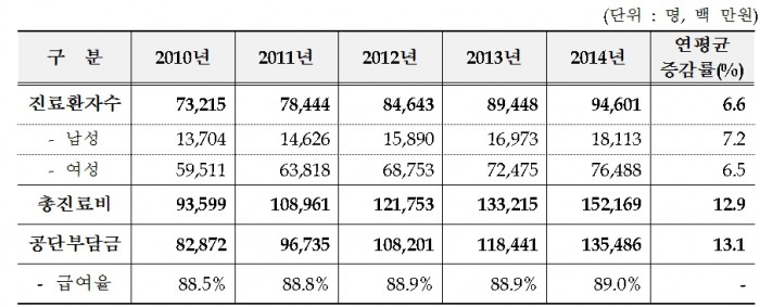 류마티스관절염 환자가 늘어남에 따라 총진료비도 증가했다. 총진료비는 2010년 936억원에서 2014년 1522억원으로 62.6% 증가했다.