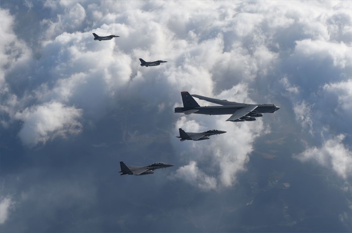 (서울=포커스뉴스) 북한의 수소폭탄 실험 이후 미국의 핵우산 제공 방침에 따라 미 공군의 전략 폭격기가 한반도로 전개한 10일 B-52 폭격기와 우리 공군의 F-15K, 미군 F-16 전투기가 한반도 상공을 날고 있다. <사진제공=공군>