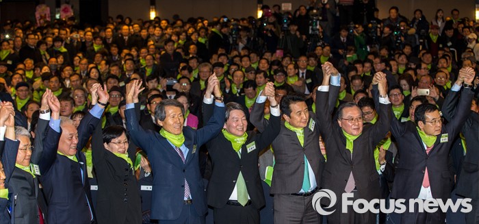 (서울=포커스뉴스) 안철수(왼쪽 다섯 번째)) 무소속 의원이 10일 오후 서울 종로구 세종문화회관 세종홀에서 열린 '국민의당(가칭) 창당발기인대회'에서 주요 창당준비 관계자들과 손을 들고 사진촬영을 하고 있다.