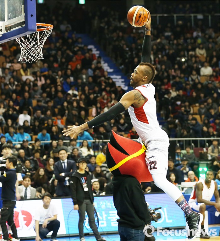 (서울=포커스뉴스) 10일 서울 잠실실내체육관에서 열린 2015-2016 프로농구 올스타전 덩크 컨테스트에서 우승한 블레이클리가 마스코트를 앞에 세워 놓고 원핸드 덩크를 성공시키고 있다.