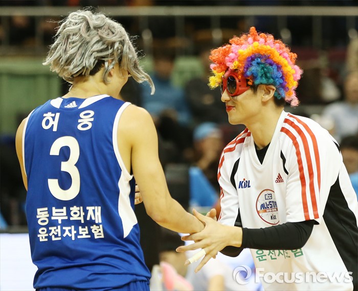 (서울=포커스뉴스) 10일 서울 잠실실내체육관에서 열린 2015-2016 프로농구 올스타전에서 시니어팀의 양동근(오른쪽)과 주니어팀의 허웅이 메이크업 슈팅 행사에서 벌칙으로 화장하고 가발을 쓴채 악수하고 있다.