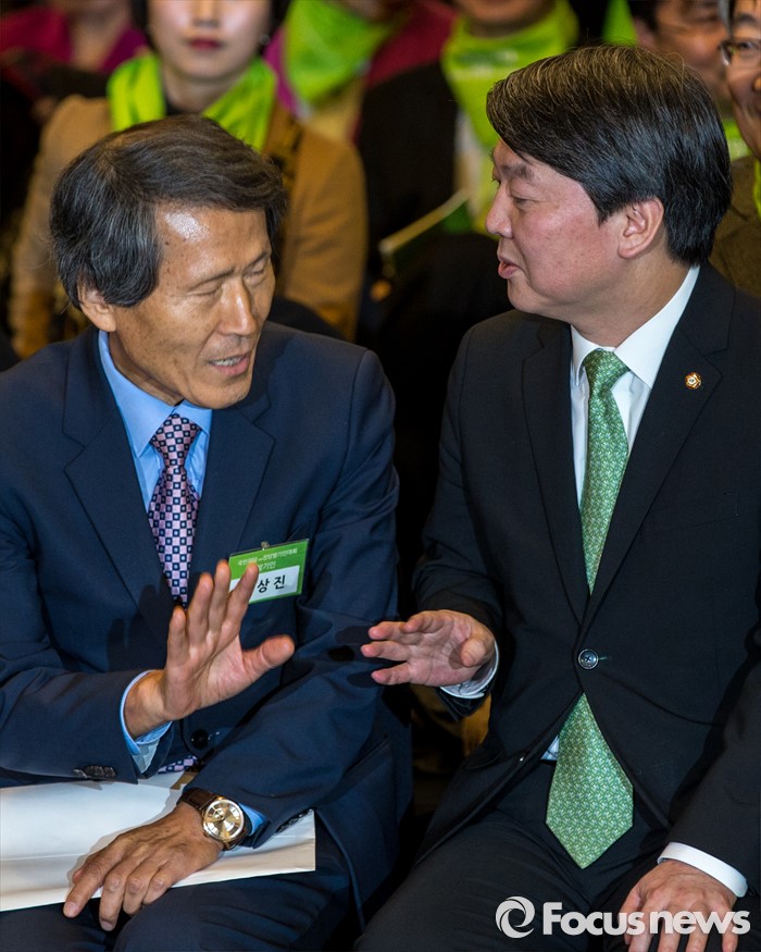 (서울=포커스뉴스) 안철수(오른쪽) 국민의당 의원과 한상진 국민의당 창당준비위원회 공동위원장이 10일 오후 서울 종로구 세종문화회관 세종홀에서 열린 '국민의당 창당발기인대회'에 자리해 대화를 나누고 있다.