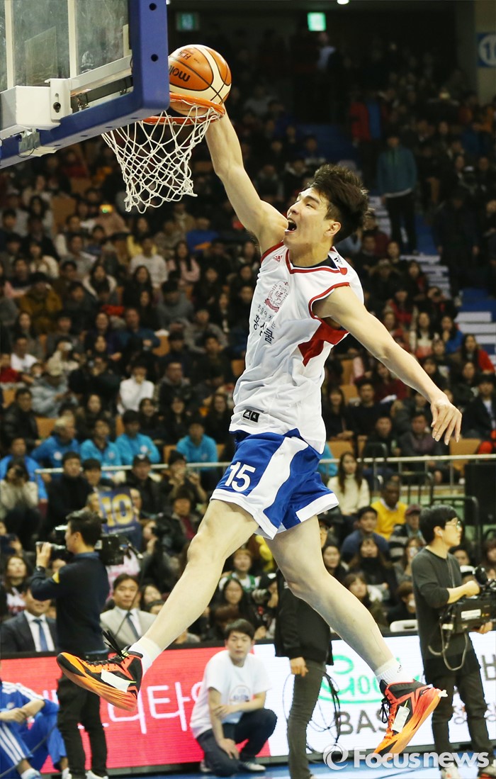 (서울=포커스뉴스) 10일 서울 잠실실내체육관에서 열린 2015-2016 프로농구 올스타전 덩크 컨테스트에서 우승한 김종규가 호쾌한 원핸드 덩크슛을 꽂아 넣고 있다.