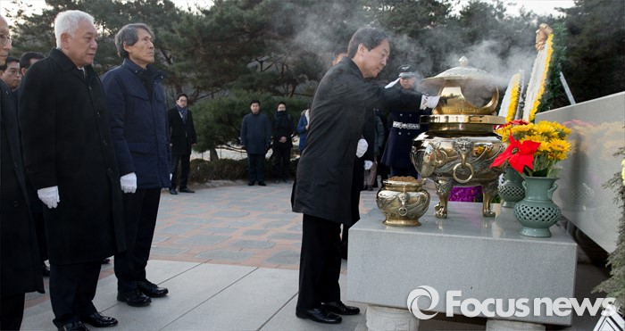 (서울=포커스뉴스) '국민의당' 창당을 추진하는 안철수 의원이 11일 오전 서울 동작구 국립서울현충원 故 김대중 전 대통령 묘역을 방문해 참배를 하고 있다.