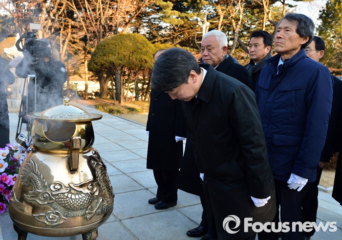 (서울=포커스뉴스) 안철수 의원, 한상진 공동창당준비위원장, 김한길 의원 등이 11일 오전 서울 동작구 국립서울현충원 이승만 대통령 묘역을 찾아 참배하고 있다.