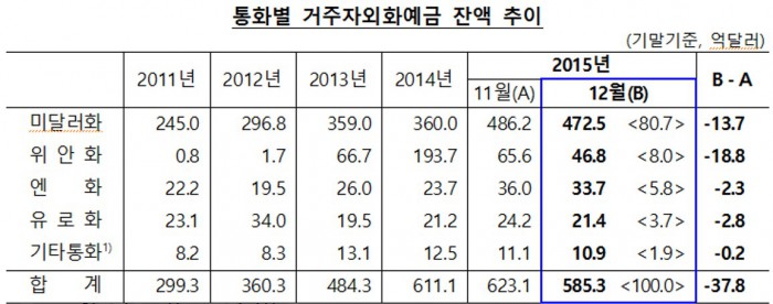 12월말 현재 외국환은행의 거주자외화예금은 585억3000만달러로 전월말 대비 37억8000만달러 줄었다.<자료출처=한국은행>