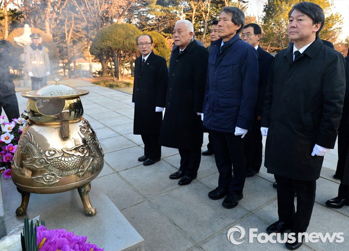 (서울=포커스뉴스) 안철수(오른쪽부터) 의원과 한상진 공동창당준비위원장, 김한길 의원 등이 11일 오전 서울 동작구 국립서울현충원 이승만 대통령 묘역을 찾아 참배하고 있다.
