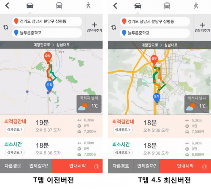 이해열 SK플래닛 LBS사업본부장은 “앞으로 정확하고 최적화된 길안내뿐만 아니라 스마트폰 기반의 운전 경험의 극대화를 이룰 수 있는 서비스가 되도록 최선을 다하겠다”라고 밝혔다.SK플래닛 T맵 4.5버전 업데이트 화면 예시.<사진제공=SK플래닛>