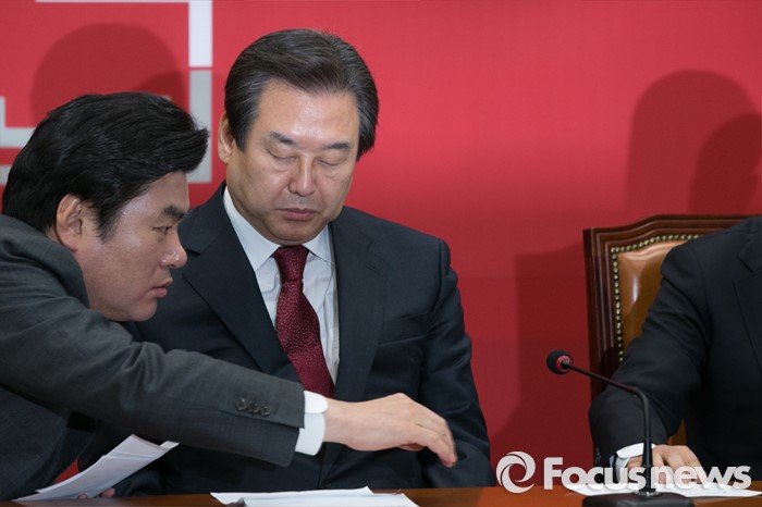 (서울=포커스뉴스) 원유철(왼쪽) 새누리당 원내대표가 11일 오전 서울 여의도 국회에서 열린 최고위원회의에 참석해 김무성(가운데) 대표와 서청원(오른쪽) 최고위원에게 문서를 전달하고 있다.