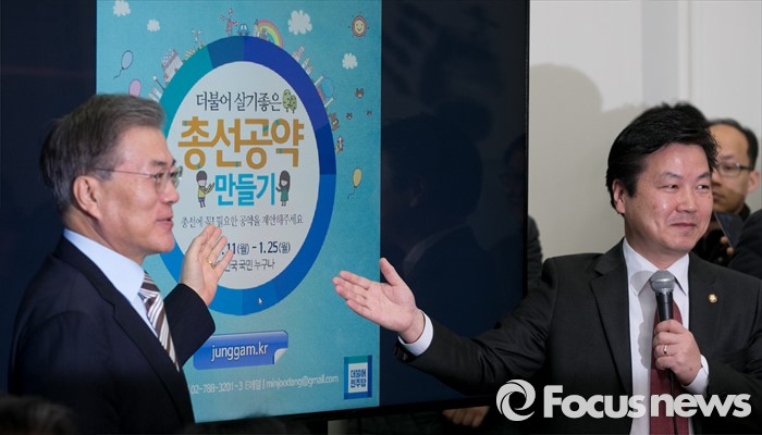 (서울=포커스뉴스) 문재인(왼쪽) 더불어민주당 대표와 홍종학 디지털소통본부장이 11일 오전 서울 여의도 국회에서 열린 최고위원회의에 앞서 20대 총선 공약 공모 마켓인 '정감마켓' 커뮤니티를 취재진에게 소개하고 있다.