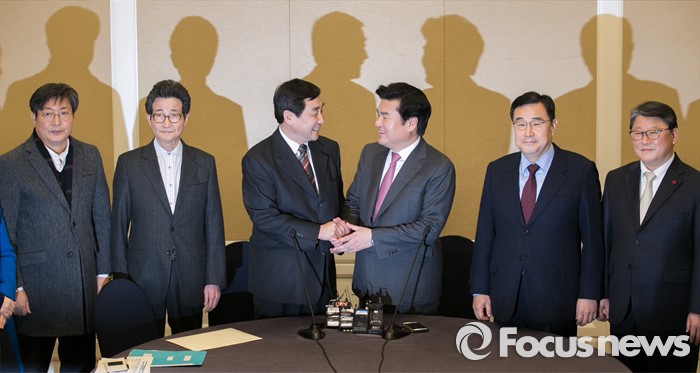 (서울=포커스뉴스) 11일 오전 서울 여의도 국회 귀빈식당에서 20대 총선 선거구 획정 기준 및 쟁점 법안 논의를 위해 진행된 여야 원내지도부 회동에 참석한 의원들이 인사하고 있다. 왼쪽부터 이춘석 더불어민주당 원내수석부대표, 이목희 정책위의장, 이종걸 원내대표, 원유철 새누리당 원내대표, 김정훈 정책위의장, 조원진 원내수석부대표.