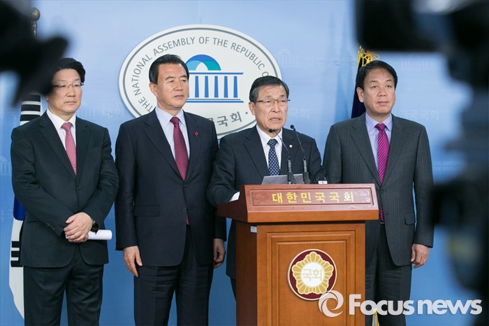 (서울=포커스뉴스) 황진하(오른쪽 두번째) 새누리당 사무총장이 11일 오전 서울 여의도 국회 정론관에서 공천룰과 관련해, 기자회견을 하고 있다.