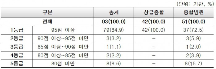93기관 중 1등급은 79기관(84.9%)이었으며, △2등급 3기관(3.2%) △3등급 1기관(1.1%) △4등급 2기관(2.2%) △5등급 8기관(8.6%) 순이었다. 총 19개 평가지표에서의 평균점수 역시 95점 이상으로 높게 나타났다.