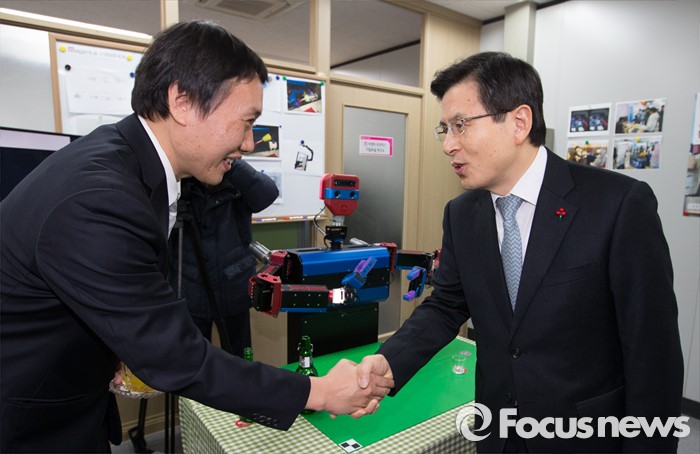 (대전=포커스뉴스) 황교안 국무총리가 11일 대전 유성구 융합기술연구생산센터 내 마젠타로보틱스를 방문, 권기현 대표이사와 악수하고 있다.