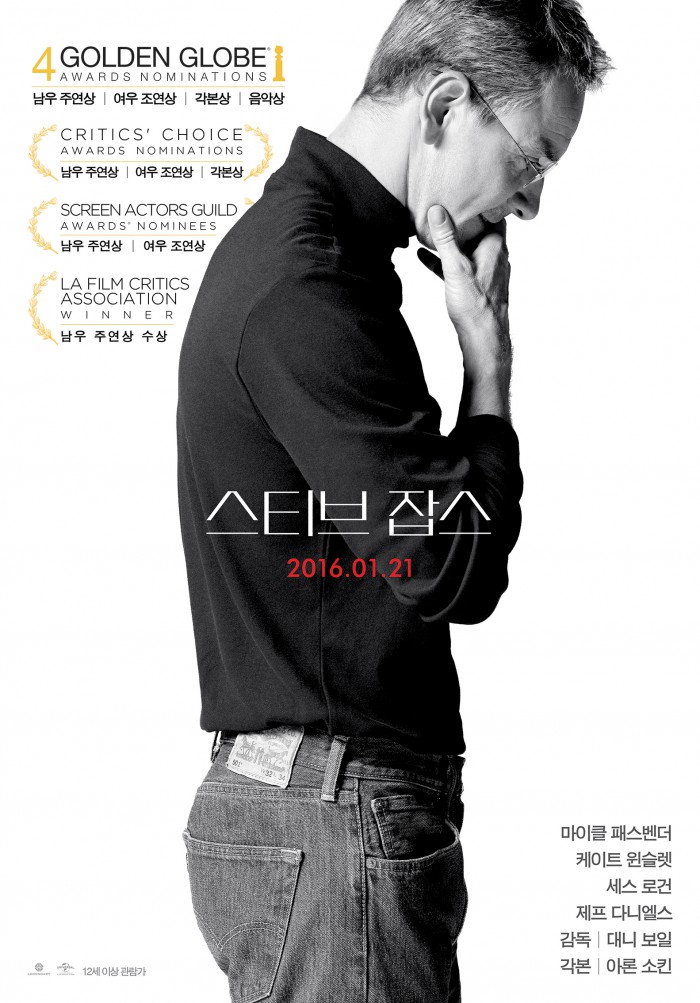 '스티브 잡스'는 월터 아이작슨이 쓴 동명의 베스트셀러를 바탕으로 '인터스텔라' '다크 나이트' 시리즈의 레전더리 픽쳐스가 제작하고, 아카데미 감독 대니 보일이 연출한 작품으로 3번의 혁신적 프레젠테이션 무대 뒤 펼쳐지는 숨 막히는 열기와 천재 스티브 잡스의 열정과 광기를 담았다. 오는 21일 국내 개봉한다.영화 '스티브잡스'가 10일(현지시간) 오후 미국 LA 비버리 힐튼 호텔에서 할리우드 외신기자협회 주최로 열린 '제73회 골든글로브 시상식'에서 각본상(아론 소킨)과 여우조연상 (케이트 윈슬렛)을 수상했다. 사진은 영화 포스터. <사지제공=UPI>