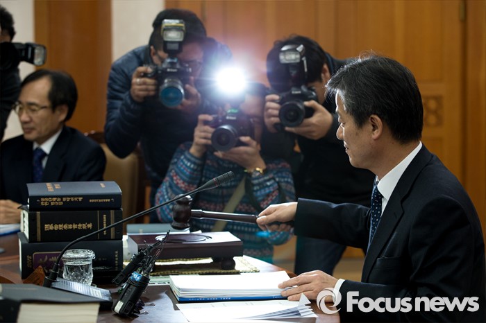 (과천=포커스뉴스) 이인복 중앙선거관리위원회 위원장이 11일 오후 경기도 과천시 중앙선거관리위원회에서 열린 전체회의에 자리해 의사봉을 두드리고 있다. 이날 이 위원장은 오는 4월 13일 총선 '선거구 실종' 장기화 사태에 따른 대책을 모색할 예정이다.