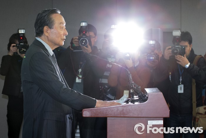 (서울=포커스뉴스) 권노갑 더불어민주당 상임고문이 12일 오전 서울 여의도 국회 정론관에서 탈당 기자회견을 하고 있다.