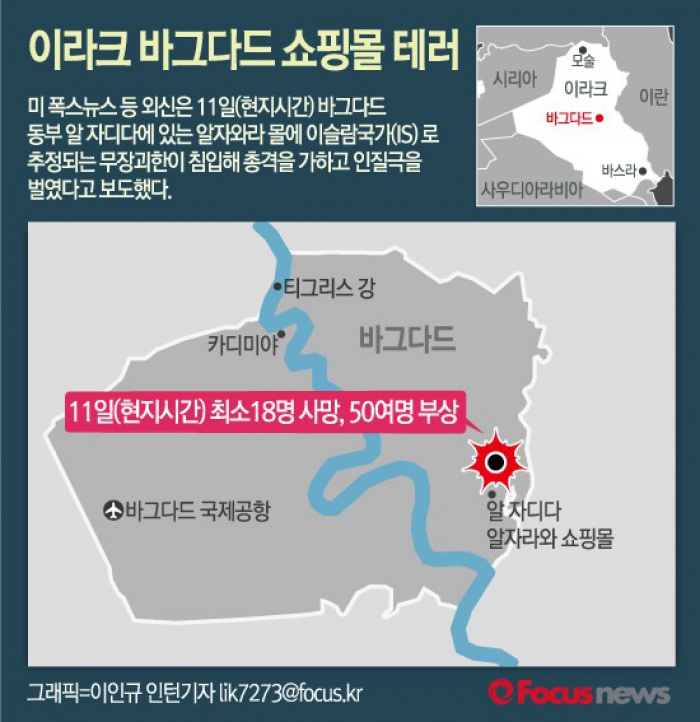 (서울=포커스뉴스) 미 폭스뉴스 등 외신은 11일(현지시간) 바그다드 동부 알 자디다에 있는 알자와라 몰에 이슬람국가(IS) 로 추정되는 무장괴한이 침입해 총격을 가하고 인질극을 벌였다고 보도했다.