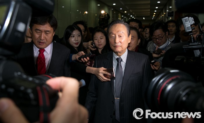 (서울=포커스뉴스) 권노갑 더불어민주당 상임고문이 12일 오전 서울 여의도 국회 정론관에서 탈당 기자회견을 마친 뒤 이동하고 있다.