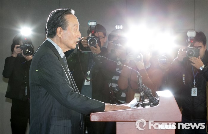 (서울=포커스뉴스) 권노갑 더불어민주당 상임고문이 12일 오전 서울 여의도 국회 정론관에서 탈당 기자회견을 하고 있다.