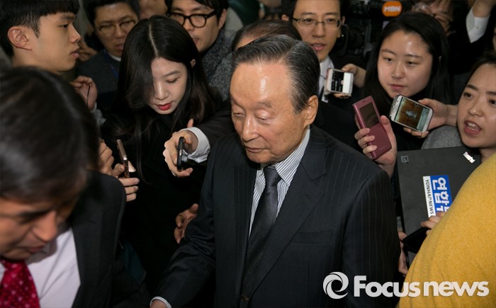 (서울=포커스뉴스) 권노갑 더불어민주당 상임고문이 12일 오전 서울 여의도 국회 정론관에서 탈당 기자회견을 마친 뒤 이동하고 있다.