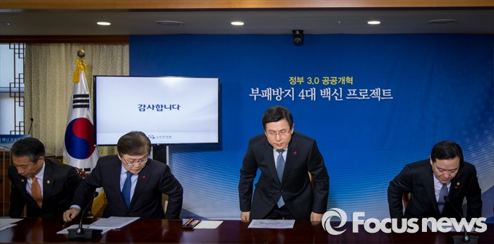 (서울=포커스뉴스) 12일 오전 서울 종로구 정부서울청사에서 황교안(왼쪽 세 번째) 국무총리가 부패방지 4대 백신 프로젝트를 발표 후 자리에서 일어나고 있다. 정부는 이날 발표를 통해 실시간 감시, 리스크 관리, 정보상시 공유ㆍ연계, 내부클린시스템의 4대 백신 프로젝트를 2016년 부터 16개 분야, 240조원 운용 규모의 공공시스템에 본격 가동한다고 밝혔다.