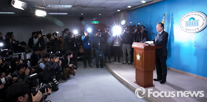 (서울=포커스뉴스) 권노갑 더불어민주당 상임고문이 12일 오전 서울 여의도 국회 정론관에서 탈당 기자회견을 하고 있다.