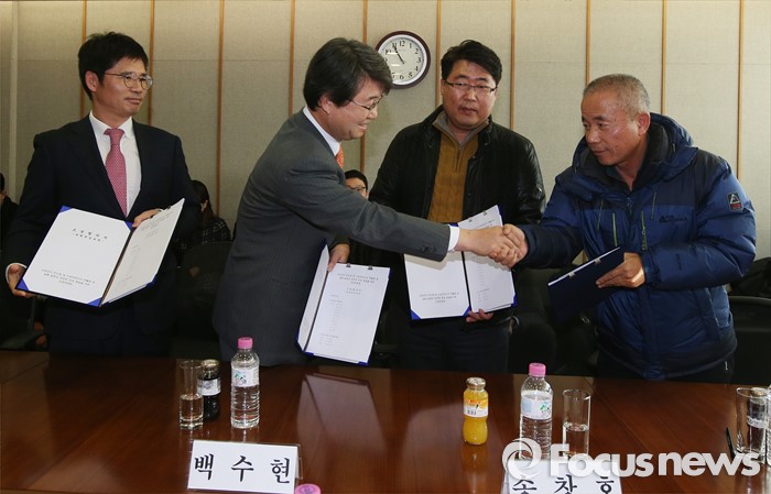 (서울=포커스뉴스) 12일 오전 서울 서대문구 충정로 법무법인 지평 회의실에서 열린 '삼성전자 반도체 등 사업장에서의 백혈병 등 질환 발병과 관련한 문제 해결을 위한 조정위원회'에서 조정 주체 교섭단 대표자들이 최종 합의서에 서명한 뒤 악수를 하고 있다.